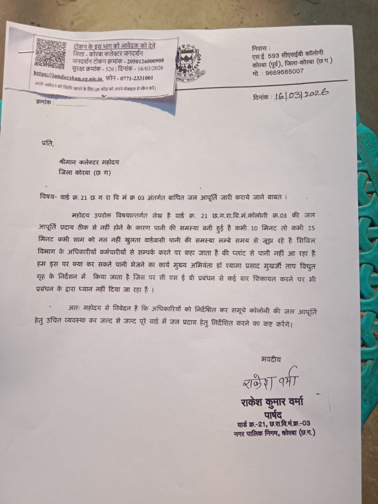 त्रिनेत्र टाइम्स कोरबा ***//** कोरबा नगर पालिक निगम क्षेत्र के वार्ड क्रमांक-21 में लगातार बनी हुई जल संकट...
