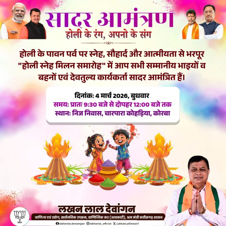 त्रिनेत्र टाइम्स कोरबा ***//** कोरबा। रंगों के पावन पर्व होली के अवसर पर 4 मार्च 2026, बुधवार को...