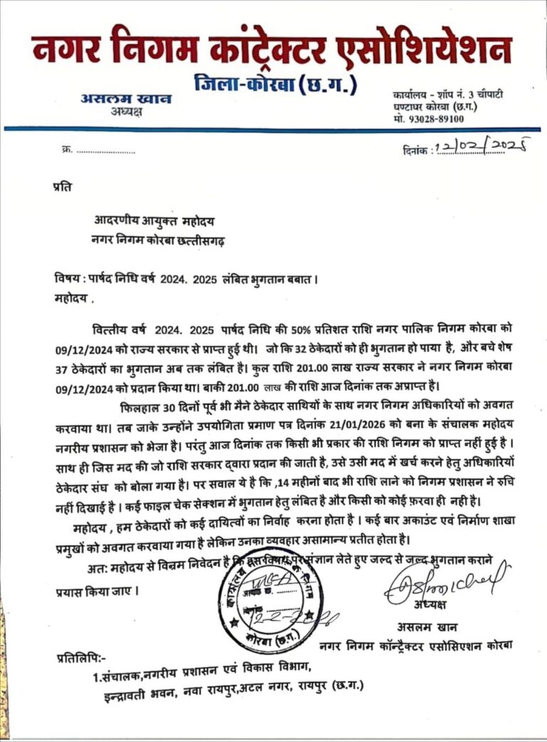 त्रिनेत्र टाइम्स कोरबा ****//** कोरबा, 12 फरवरी 2026। नगर निगम कोरबा में ठेकेदारों के भुगतान को लेकर बड़ा...
