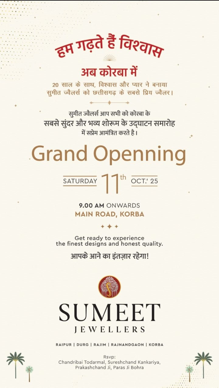 कोरबा। छत्तीसगढ़ का प्रसिद्ध और विश्वसनीय नाम सुमीत ज्वेलर्स अब कोरबा में अपनी नई शाखा की शुरुआत करने जा रहा...