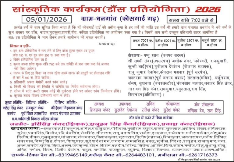 नववर्ष पर डांस, नाटक, गीत–कविता से सजेगा ग्राम पंचायत धनगांव का मंच त्रिनेत्र टाइम्स कोरबा*****/// कोरबा। कोरबा जिले...