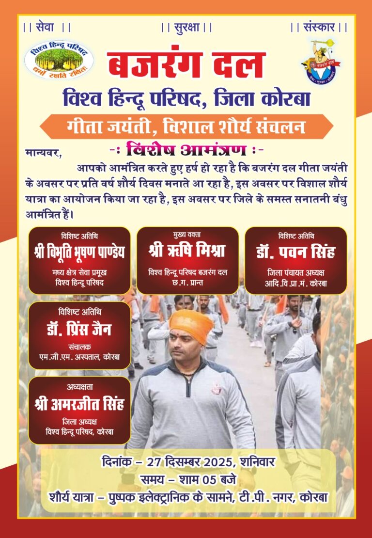 त्रिनेत्र टाइम्स कोरबा ****/ कोरबा हिन्दू समाज की एकता, शौर्य, संस्कार और सांस्कृतिक चेतना को सशक्त रूप देने के उद्देश्य...