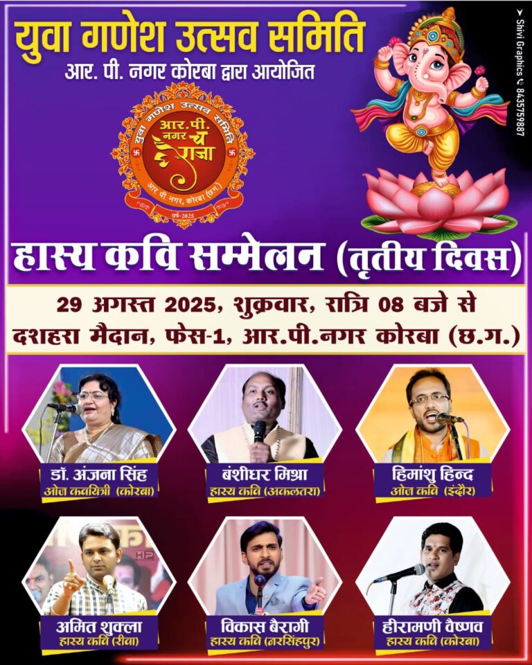 कोरबा।आर. पी. नगर कोरबा द्वारा आयोजित युवा गणेश उत्सव समिति के भव्य आयोजन में हास्य कवि सम्मेलन का तीसरा दिन...