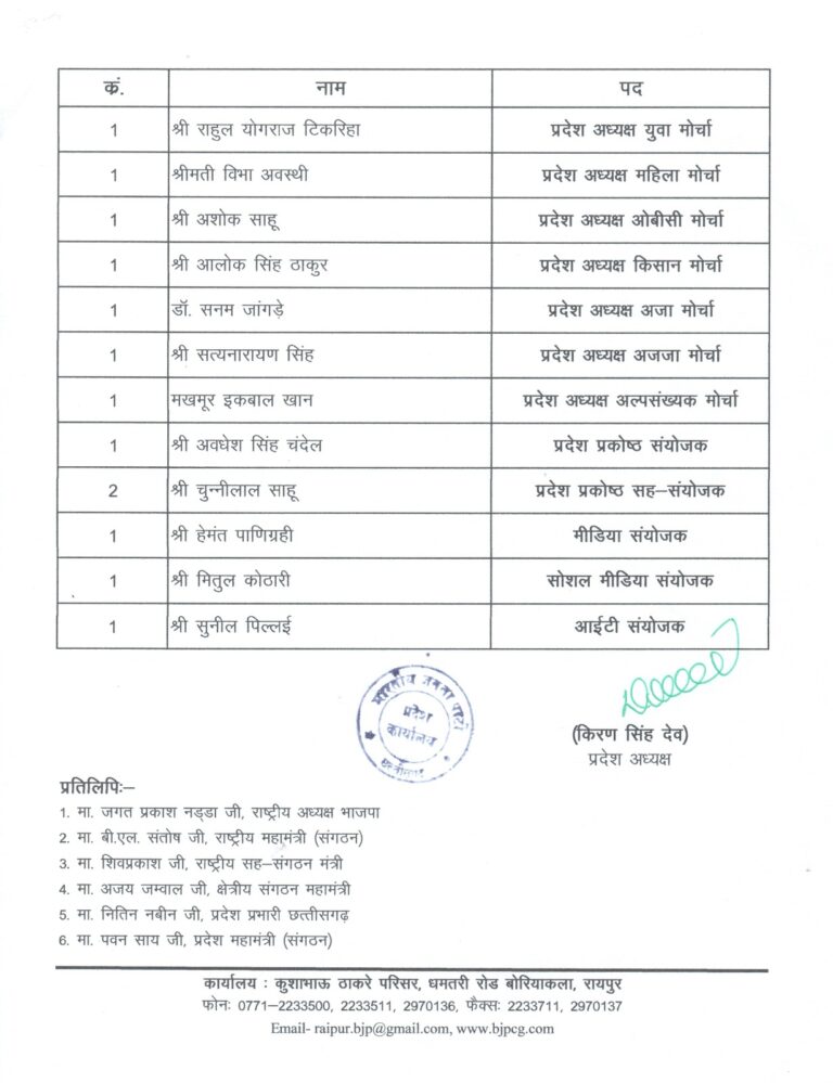 त्रिनेत्र टाइम्स रायपुर/कोरबा।भारतीय जनता पार्टी के राष्ट्रीय अध्यक्ष श्री जगत प्रकाश नड्डा जी की सहमति से भाजपा प्रदेश अध्यक्ष श्री...