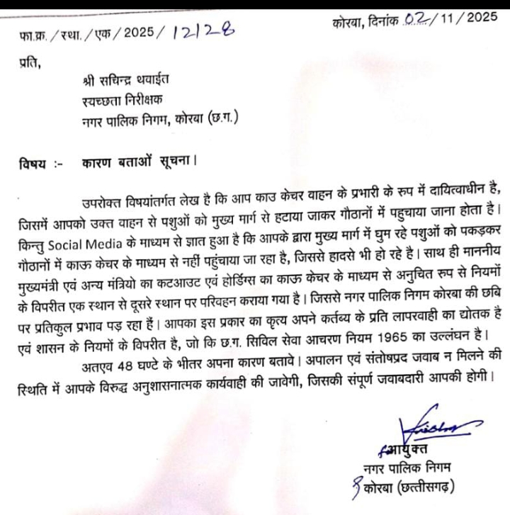 त्रिनेत्र टाइम्स कोरबा ****/कोरबा, 02 नवम्बर 2025। नगर निगम कोरबा में स्वच्छता व्यवस्था से जुड़ा एक गंभीर मामला...