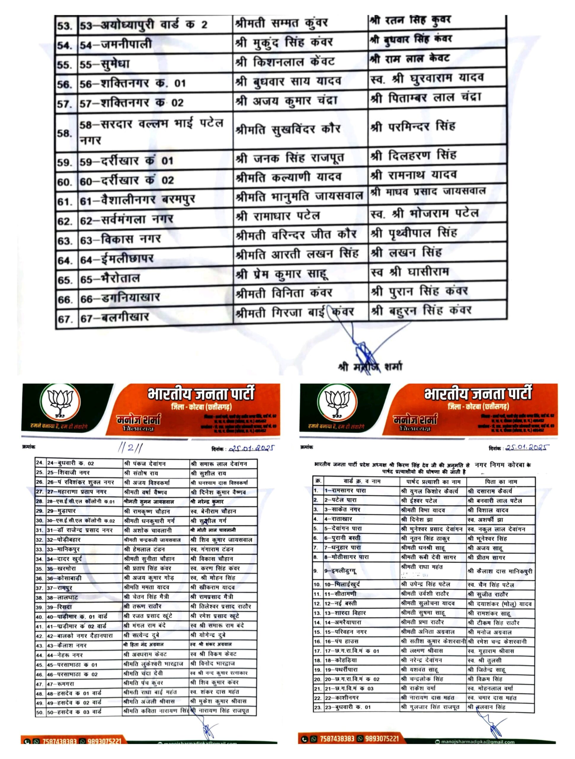 त्रिनेत्र टाइम्स कोरबा ****/ शनिवार शाम भारतीय जनता पार्टी ने कोरबा नगर निगम समेत जिले सभी नगरीय निकायों के लिए पार्षद व अध्यक्ष प्रत्याशियों के नाम जारी कर दिए। कांग्रेस से पहले उम्मीदवारों की घोषणा कर भाजपा ने मैदान में पहला कदम रखने के साथ उम्दा रणनीतिक दांव खेल दिया है। युद्ध का शंखनाद करने के साथ ही BJP की सुपर-67 में शामिल कद्दावरों की फौज देख कांग्रेसी रणनीतिकारों की नींद भी उड़ा दी है।