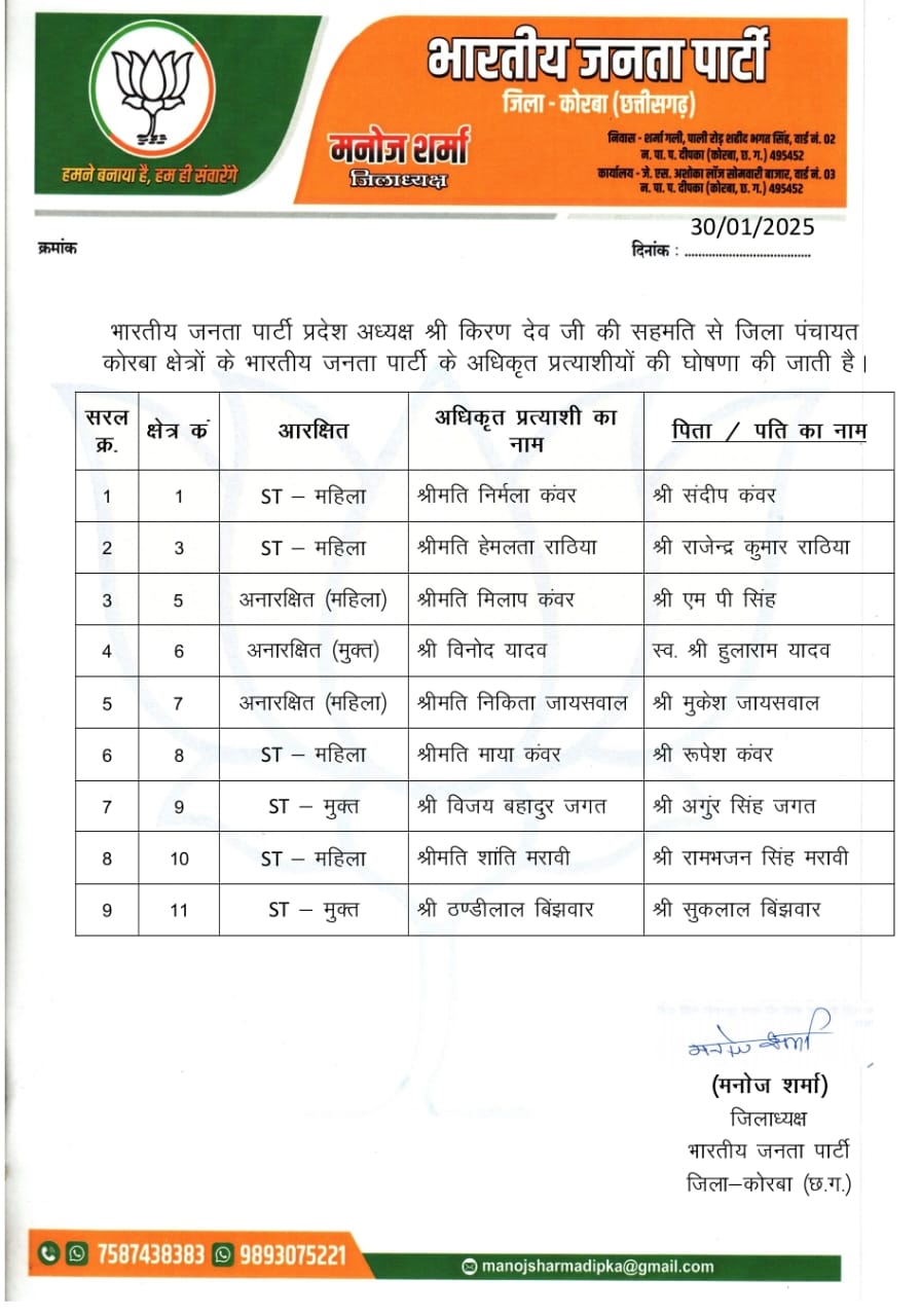 त्रिनेत्र टाइम्स कोरबा, ****/ 31 जनवरी 2025 – आगामी जिला पंचायत चुनाव के लिए भारतीय जनता पार्टी (भाजपा) समर्थित प्रत्याशियों की आधिकारिक सूची जारी कर दी गई है। यह घोषणा भाजपा प्रदेश अध्यक्ष श्री किरण सिंह देव के निर्देशानुसार भाजपा जिला अध्यक्ष श्री मनोज शर्मा द्वारा की गई।