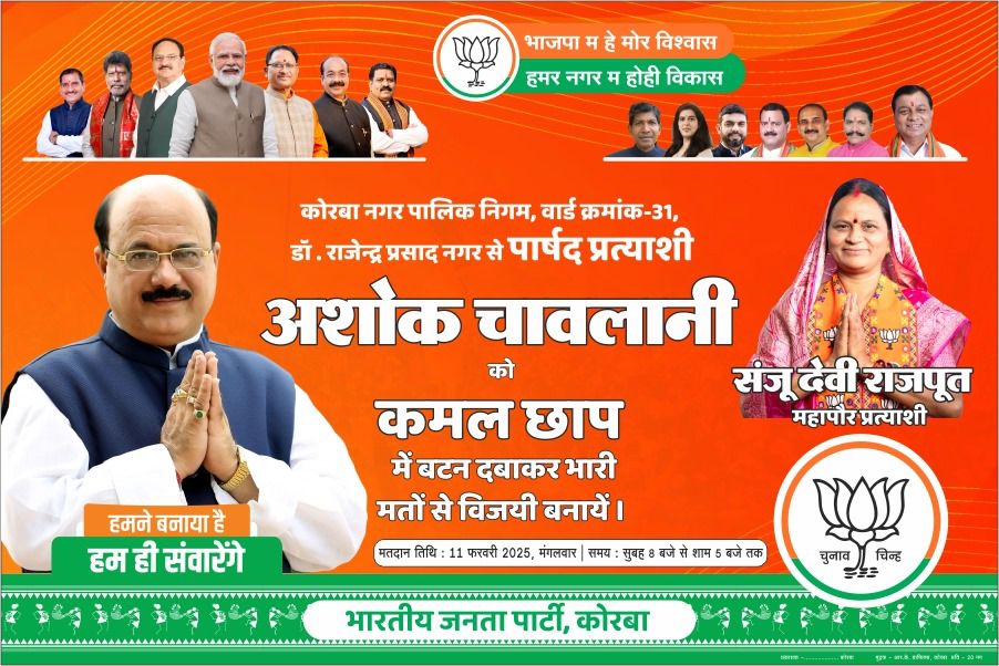 त्रिनेत्र टाइम्स कोरबा ****/ वार्ड 31, : नगर निगम चुनाव को लेकर वार्ड क्रमांक 31 में चुनावी सरगर्मी तेज हो गई है। भारतीय जनता पार्टी के पार्षद प्रत्याशी भैया अशोक चावलानी ने जनसंपर्क अभियान को गति देते हुए मतदाताओं से भाजपा को चुनने की अपील की।
