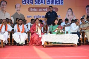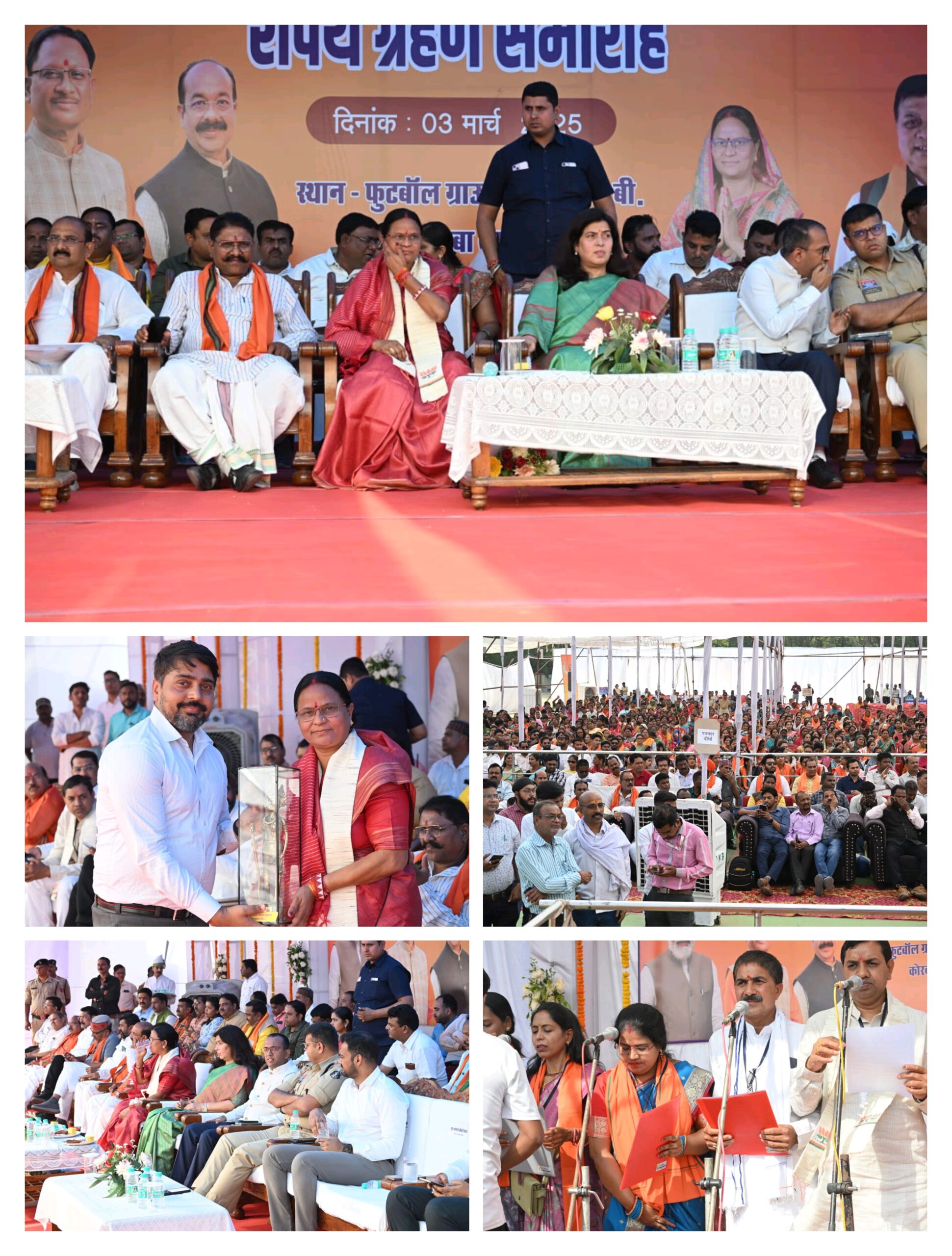 त्रिनेत्र टाइम्स कोरबा, 03 मार्च 2025। कोरबा नगर के सीएसईबी फुटबॉल ग्राउंड में नगर निगम के नवचयनित महापौर श्रीमती संजू देवी राजपूत एवं पार्षदगणों का शपथ ग्रहण समारोह भव्य रूप से संपन्न हुआ। इस समारोह में पूर्व राज्यसभा सांसद सुश्री सरोज पाण्डेय की गरिमामयी उपस्थिति रही। कलेक्टर श्री अजीत वसंत ने महापौर व पार्षदों को सत्य निष्ठा से अपने दायित्वों का निर्वहन करने की शपथ दिलाई।
