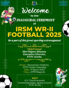 त्रिनेत्र टाइम्स कोरबा ****/ NTPC कोरबा टाउनशिप में आयोजित होने वाले IRSM WR-II FOOTBALL 2025 टूर्नामेंट का शुभारंभ एक भव्य उद्घाटन समारोह के साथ होगा। यह आयोजन फुटबॉल प्रेमियों के लिए उत्साह, जोश और खेल भावना से भरपूर एक अविस्मरणीय अनुभव होगा।