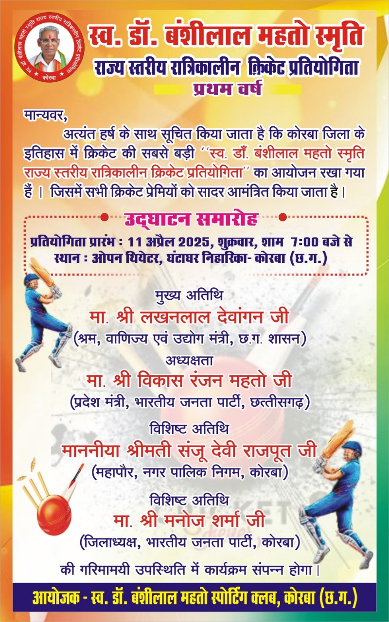 त्रिनेत्र टाइम्स कोरबा ****/ कोरबा क्रिकेट प्रेमियों के लिए एक ऐतिहासिक क्षण आज कोरबा की धरती पर लिखा जाएगा। जिले के सबसे बड़े और प्रतिष्ठित क्रिकेट आयोजन “स्व. डॉ. बंशीलाल महतो स्मृति राज्य स्तरीय रात्रिकालीन क्रिकेट प्रतियोगिता” का पहला संस्करण आज 11 अप्रैल 2025, शुक्रवार की शाम 7:00 बजे से प्रारंभ होगा। कार्यक्रम का आयोजन ओपन थिएटर, घंटाघर निहारिका, कोरबा (छ.ग.) में किया जा रहा है।