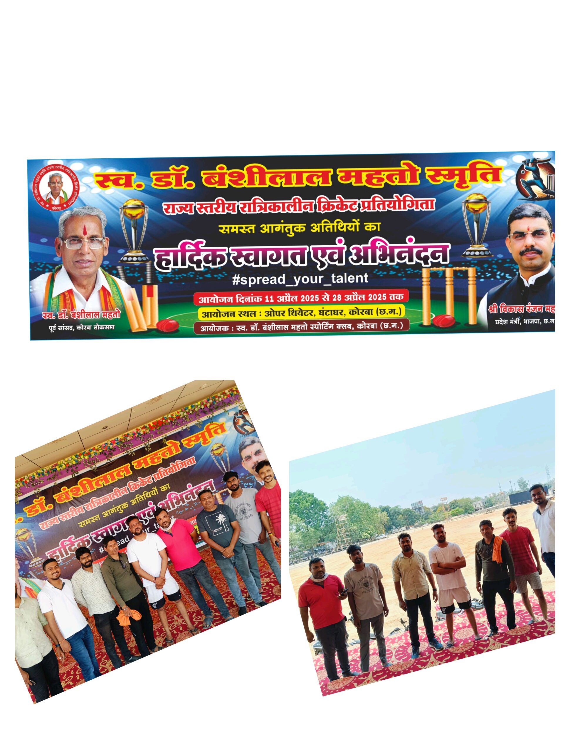 त्रिनेत्र टाइम्स कोरबा (छत्तीसगढ़) ****/– कोरबा जिले में खेल प्रेमियों के लिए एक बड़ा आयोजन शुरू होने जा रहा है। स्व. डॉ. बंशीलाल महतो स्मृति राज्य स्तरीय रात्रिकालीन क्रिकेट प्रतियोगिता का आयोजन 11 अप्रैल 2025 से 28 अप्रैल 2025 तक ओपन थिएटर, घंटाघर मैदान में किया जा रहा है। इस आयोजन को लेकर स्थानीय युवाओं में खासा उत्साह देखा जा रहा है।