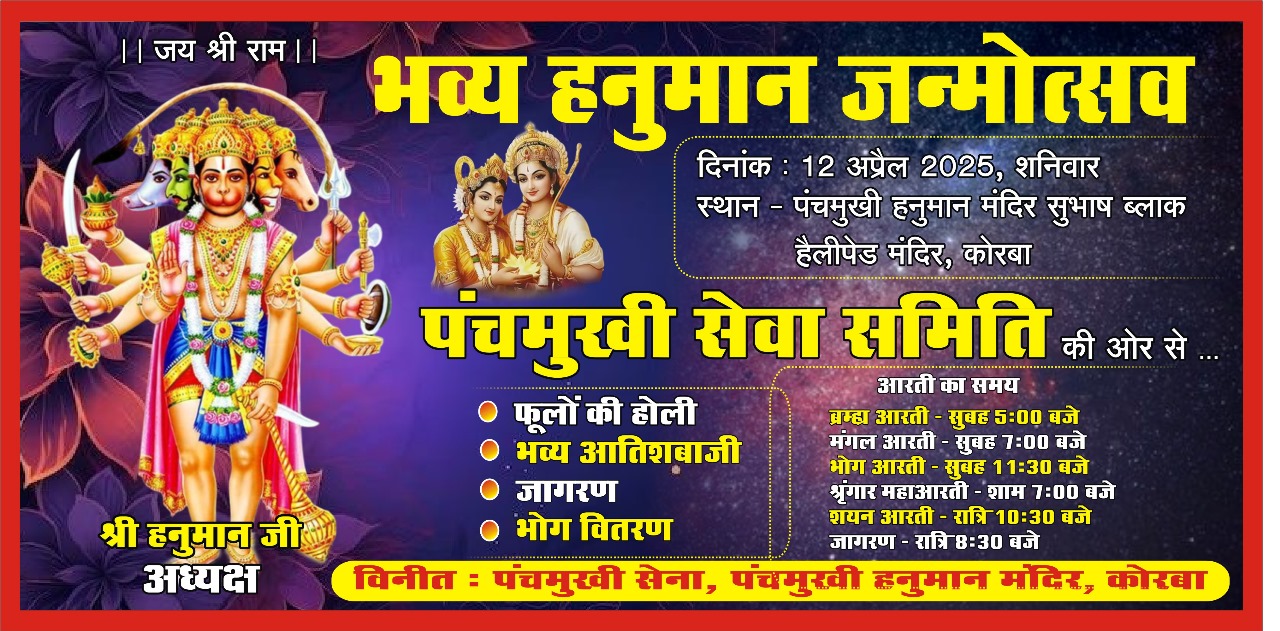 त्रिनेत्र टाइम्स कोरबा ****/। प्रभु श्रीराम के परम भक्त हनुमान जी के जन्मोत्सव पर कोरबा एक बार फिर भक्ति और उल्लास में डूबने जा रहा है। हेलीपैड स्थित पंचमुखी हनुमान मंदिर, सुभाष ब्लॉक में शनिवार, 12 अप्रैल 2025 को हनुमान जन्मोत्सव का भव्य आयोजन किया जा रहा है। आयोजन का दायित्व पंचमुखी सेवा समिति एवं पंचमुखी सेना द्वारा निभाया जा रहा है।