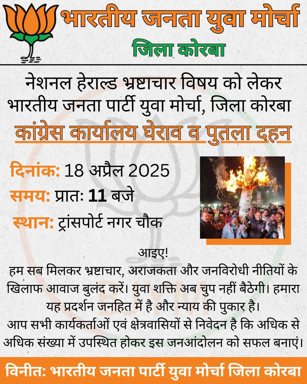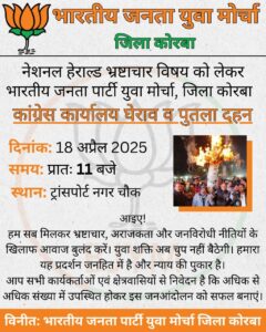 त्रिनेत्र टाइम्स कोरबा ****/ नेशनल हेराल्ड घोटाले में प्रवर्तन निदेशालय (ED) द्वारा सोनिया गांधी और राहुल गांधी समेत कांग्रेस के शीर्ष नेताओं पर की जा रही कार्रवाई के विरोध में कांग्रेस जहां देशभर में ईडी कार्यालयों का घेराव कर रही है, वहीं इसके जवाब में भारतीय जनता युवा मोर्चा (भाजयुमो) द्वारा कांग्रेस कार्यालयों के घेराव का अभियान चलाया जा रहा है। इसी कड़ी में कोरबा जिले में युवा मोर्चा के नेतृत्व में 18 अप्रैल को कांग्रेस कार्यालय का घेराव किया जाएगा और राहुल गांधी का पुतला दहन कर विरोध दर्ज किया जाएगा।