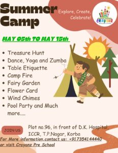 त्रिनेत्र टाइम्स कोरबा ****/ गर्मी की छुट्टियों को यादगार बनाने और बच्चों के सर्वांगीण विकास को ध्यान में रखते हुए क्रेयॉन्ज़ प्री-स्कूल द्वारा दिनांक 5 मई से 15 मई 2025 तक दस दिवसीय समर कैंप का आयोजन किया जा रहा है। यह शिविर बच्चों के लिए मनोरंजन, रचनात्मकता और शारीरिक गतिविधियों का आदर्श संगम होगा।