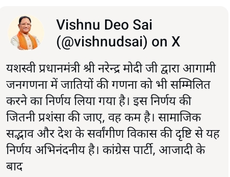 प्रधानमंत्री मोदी द्वारा जातिगत जनगणना का ऐतिहासिक निर्णय, छत्तीसगढ़ के मुख्यमंत्री विष्णु देव साय ने किया स्वागत