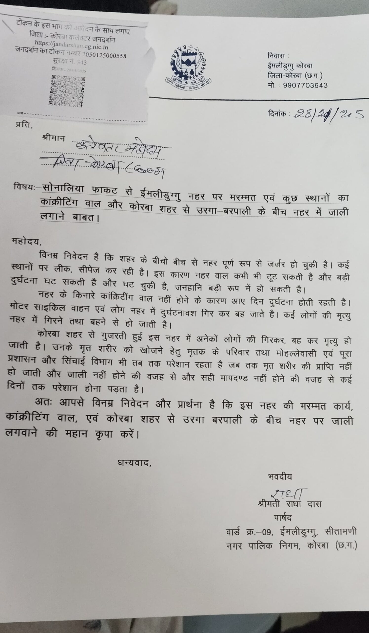 त्रिनेत्र टाइम्स कोरबा, — नगर पालिक निगम, कोरबा के वार्ड क्रमांक 09, ईमलीडुगु क्षेत्र की पार्षद श्रीमती राधा दास ने एक पत्र के माध्यम से नगर प्रशासन का ध्यान ईमलीडुगु नहर की जर्जर स्थिति की ओर आकृष्ट कराया है। उन्होंने नगर के सोनालिया फाटक से लेकर ईमलीडुगु नहर पर मरम्मत और कुछ स्थानों पर जाली लगाने की मांग की है, विशेषकर उरगा-बरपाली मार्ग के बीच स्थित नहर के लिए।
