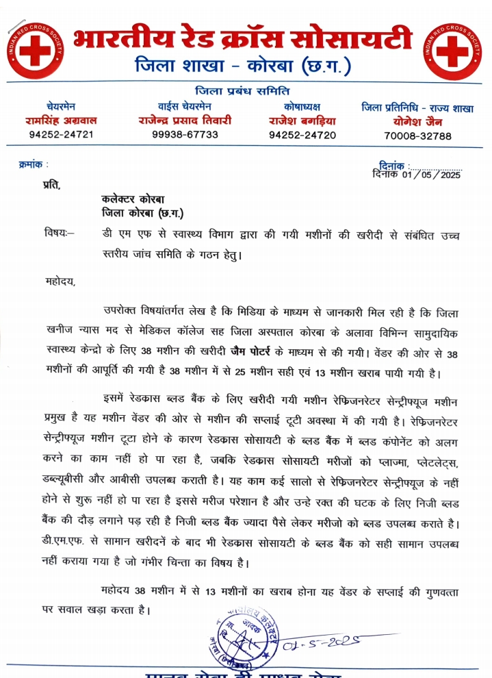 त्रिनेत्र टाइम्स कोरबा ****/ कोरबा जिले की भारतीय रेड क्रॉस सोसायटी ने स्वास्थ्य विभाग द्वारा खरीदी गई चिकित्सा मशीनों की गुणवत्ता पर गंभीर सवाल खड़े किए हैं। इस संबंध में संस्था के चेयरमैन रामसिंह अग्रवाल द्वारा कलेक्टर कोरबा को दो अलग-अलग पत्रों के माध्यम से अवगत कराया गया है।