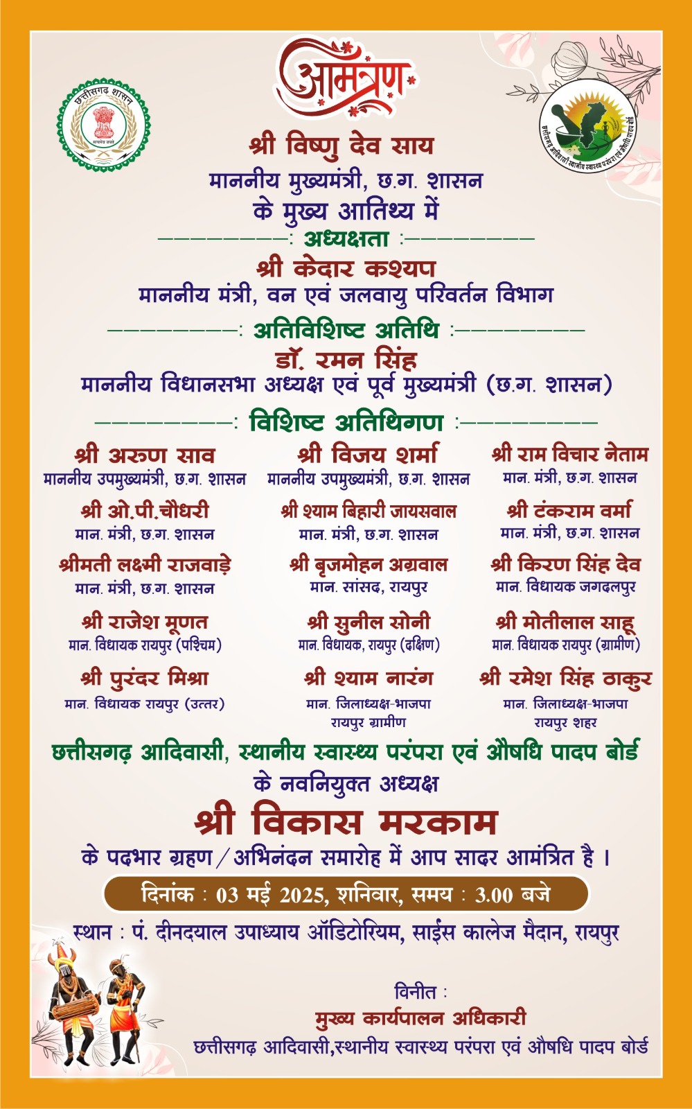 त्रिनेत्र टाइम्स कोरबा ****/ रायपुर। छत्तीसगढ़ की आदिवासी, स्थानीय स्वास्थ्य परंपरा एवं औषधि पादप बोर्ड को नया अध्यक्ष मिल गया है। विकास मरकाम को बोर्ड का नव नियुक्त अध्यक्ष बनाया गया है। उनके पदभार ग्रहण एवं अभिनंदन समारोह का आयोजन 3 मई 2025, शनिवार को दोपहर 3 बजे, रायपुर के साइंस कॉलेज मैदान स्थित पं. दीनदयाल उपाध्याय ऑडिटोरियम में किया जाएगा।