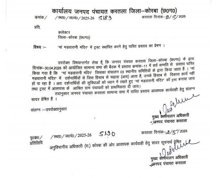 त्रिनेत्र टाइम्स कोरबा ****/ कोरबा जिले के अंतर्गत आने वाले जनपद पंचायत करतला द्वारा मड़वारानी मंदिर में ट्रस्ट की स्थापना के संबंध में एक महत्वपूर्ण प्रस्ताव पारित किया गया है। यह निर्णय 30 अप्रैल 2025 को आयोजित सामान्य सभा की बैठक में सर्वसम्मति से लिया गया।