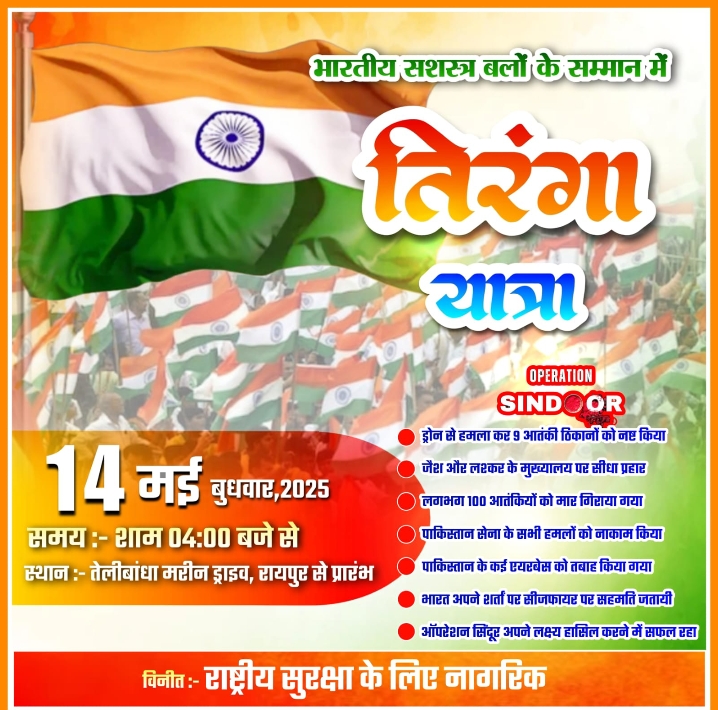 त्रिनेत्र टाइम्स कोरबा ****/ रायपुर। आतंकवाद के खिलाफ निर्णायक और सफल रणनीतिक कार्रवाई के पश्चात भारत की सुरक्षा एजेंसियों की सफलता को समर्पित “तिरंगा यात्रा” का आयोजन आगामी 14 मई, बुधवार को किया जा रहा है। इस आयोजन का उद्देश्य देश की सशस्त्र सेनाओं के अदम्य साहस, बलिदान और राष्ट्र की सुरक्षा हेतु उनके योगदान को सम्मानित करना है। यात्रा का शुभारंभ शाम 4:00 बजे रायपुर के तेलीबांधा मरीन ड्राइव से होकर नगर घड़ी चौक तक किया जाएगा।