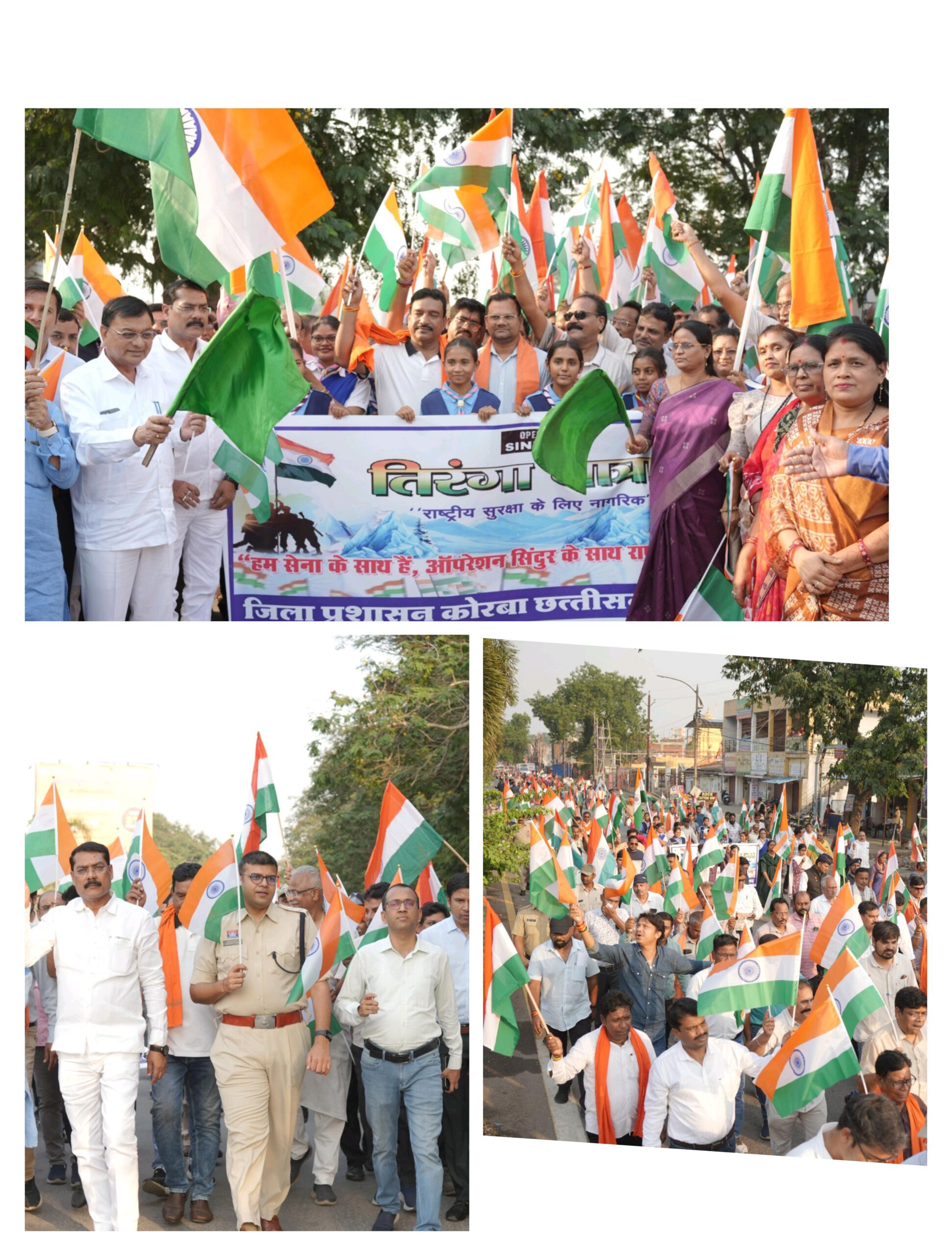 त्रिनेत्र टाइम्स कोरबा ****/ कोरबा, 17 मई 2025 – भारतीय सेना के अदम्य साहस और ऑपरेशन सिन्दूर की सफलता के उपलक्ष्य में राष्ट्रीय सुरक्षा के लिए नागरिक कार्यक्रम के अंतर्गत आज कोरबा में एक भव्य तिरंगा यात्रा का आयोजन किया गया। यह यात्रा घंटाघर चौक से प्रारंभ होकर महाराणा प्रताप चौक होते हुए पुनः घंटाघर चौक पहुंची। इस गौरवपूर्ण यात्रा में आम नागरिकों, युवाओं, बच्चों और जनप्रतिनिधियों ने उत्साहपूर्वक भाग लिया।