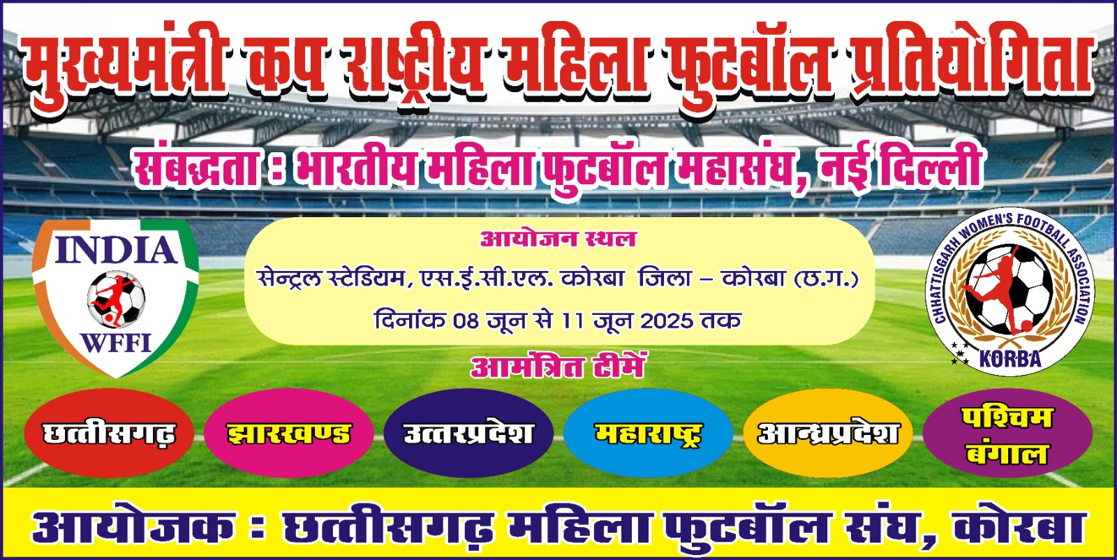 त्रिनेत्र टाइम्स कोरबा ****/ कोरबा, छत्तीसगढ़। छत्तीसगढ़ महिला फुटबॉल संघ, कोरबा के तत्वावधान में आगामी 8 जून से 11 जून 2025 तक मुख्यमंत्री कप राष्ट्रीय महिला फुटबॉल प्रतियोगिता 2025 का आयोजन किया जा रहा है। यह प्रतिष्ठित आयोजन कोरबा जिले के सेन्ट्रल स्टेडियम (एस.ई.सी.एल.) में संपन्न होगा और इसकी संबद्धता भारतीय महिला फुटबॉल महासंघ (WFFI), नई दिल्ली से है।
