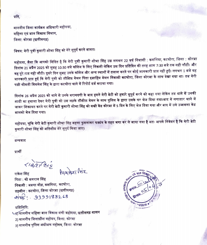 त्रिनेत्र टाइम्स कोरबा *****/ कटघोरा निवासी कुमारी शोभा सिंह प्रकरण में नया मोड़ सामने आया है। लव जिहाद के संदिग्ध मामले में पीड़िता के माता-पिता श्री राकेश सिंह एवं श्रीमती विमलेश सिंह ने आज महिला एवं बाल विकास विभाग को पत्र लिखकर अपनी पुत्री का सुपूर्दनामा मांगा है।
