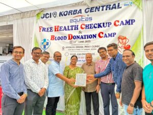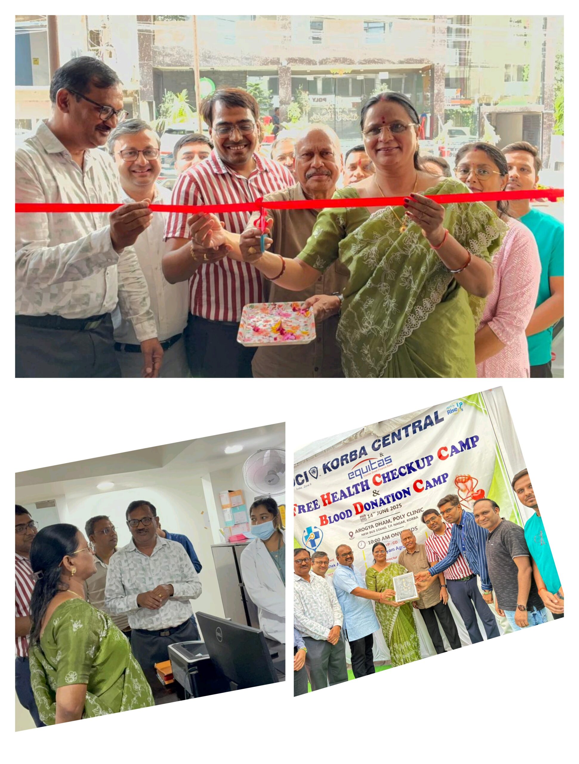 त्रिनेत्र टाइम्स कोरबा ****/ JCI कोरबा सेंट्रल एवं इक्विटास स्मॉल फाइनेंस बैंक के संयुक्त तत्वावधान में आज आरोग्य धाम, पॉली क्लिनिक, नया बस स्टैंड, टी.पी. नगर, कोरबा में निःशुल्क स्वास्थ्य परीक्षण एवं रक्तदान शिविर का भव्य आयोजन किया गया। इस जनकल्याणकारी शिविर का शुभारंभ कोरबा नगर निगम की महापौर श्रीमती संजू देवी राजपूत ने किया।