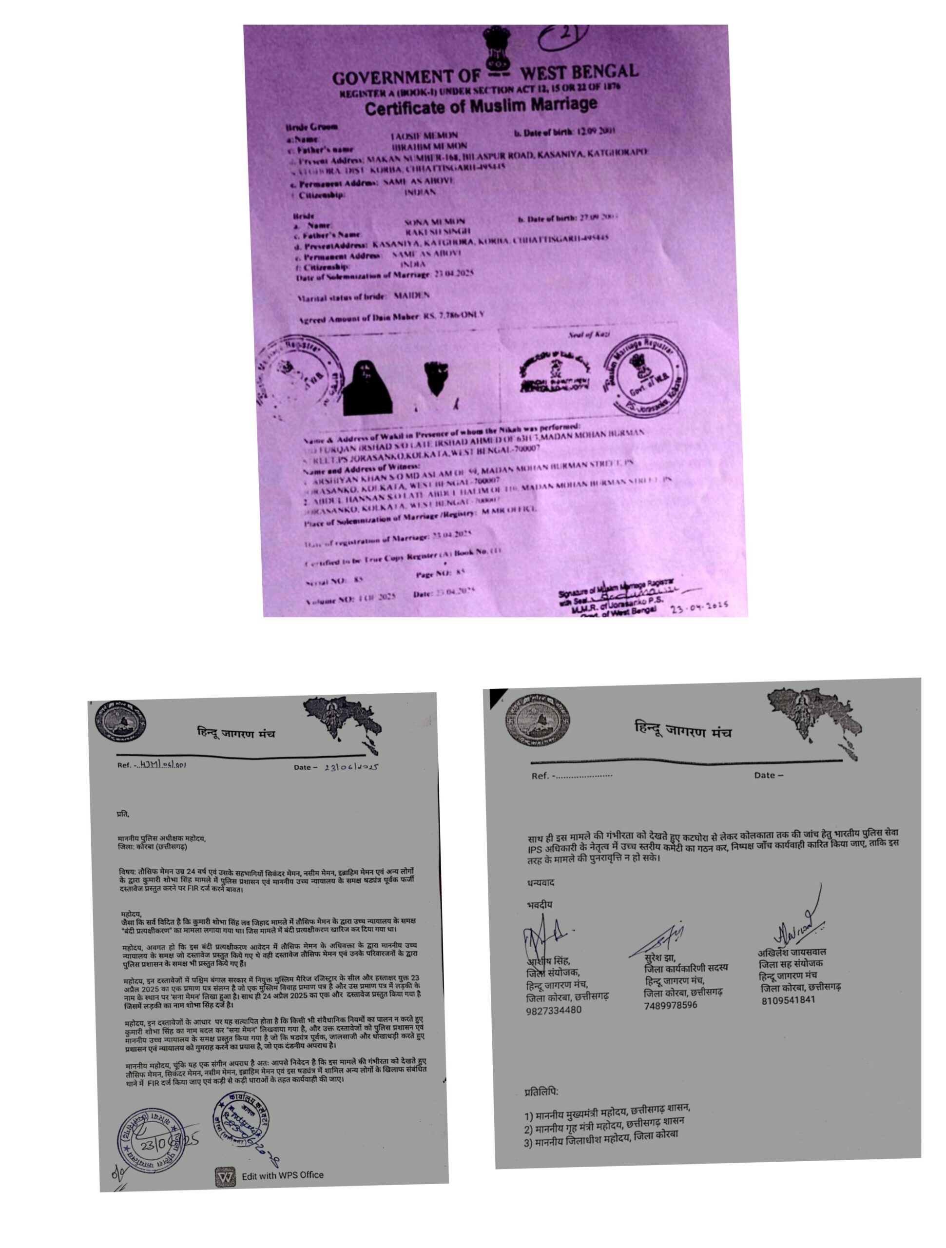 त्रिनेत्र टाइम्स कोरबा ****/ हिंदू जागरण मंच, जिला कोरबा द्वारा एक गंभीर मामला उजागर करते हुए पुलिस अधीक्षक को ज्ञापन सौंपा गया है, जिसमें न्यायालय और पुलिस प्रशासन को गुमराह करने एवं फर्जी दस्तावेज प्रस्तुत करने के आरोप लगाए गए हैं। मंच ने इस संबंध में तौसिफ मेमन (24 वर्ष) सहित सिकंदर मेमन, नसीम मेमन और इब्राहिम मेमन के विरुद्ध प्राथमिकी (FIR) दर्ज करने की मांग की है।