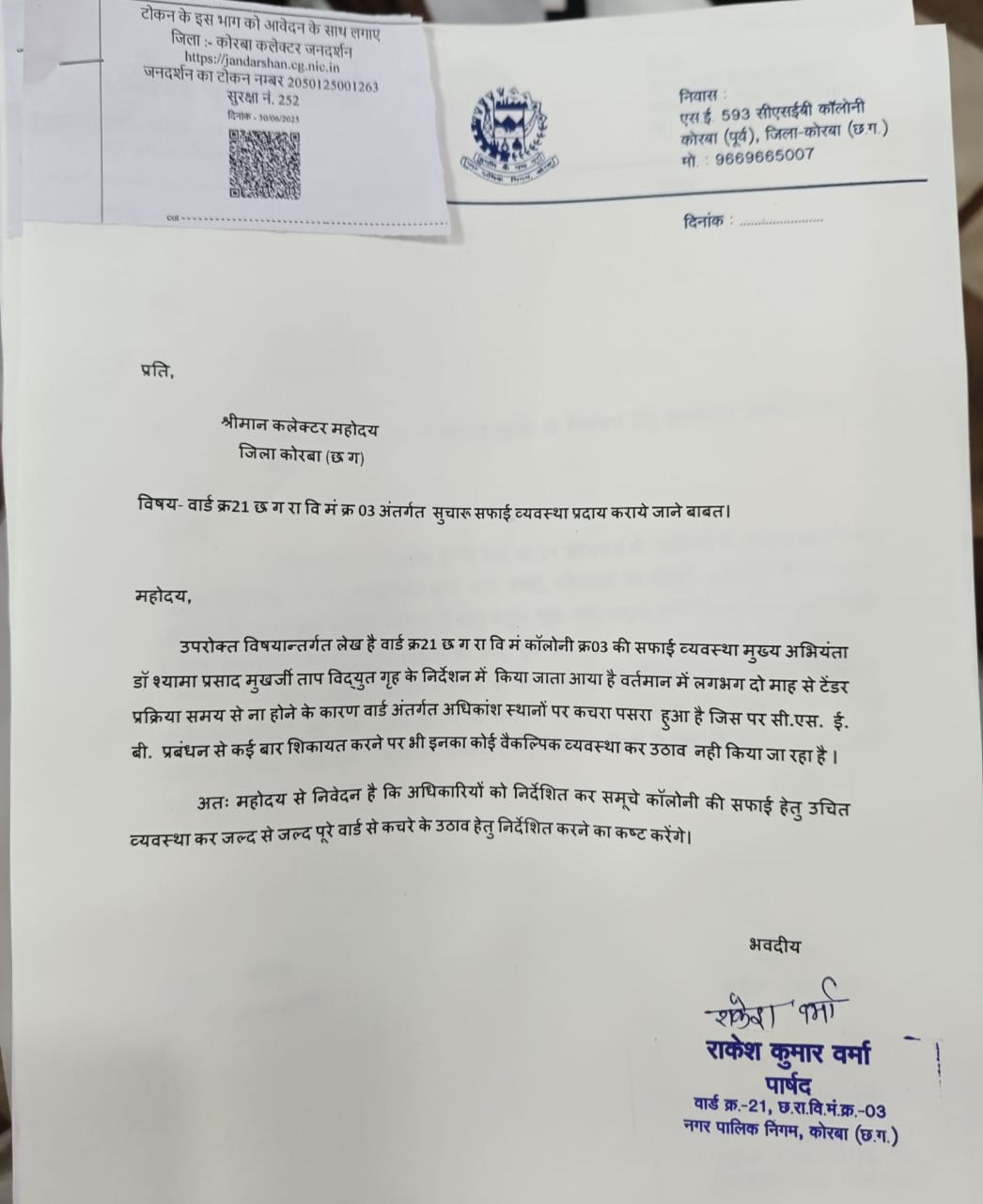 कोरबा के वार्ड 21 की सफाई व्यवस्था को लेकर पार्षद ने कलेक्टर से लगाई गुहार
