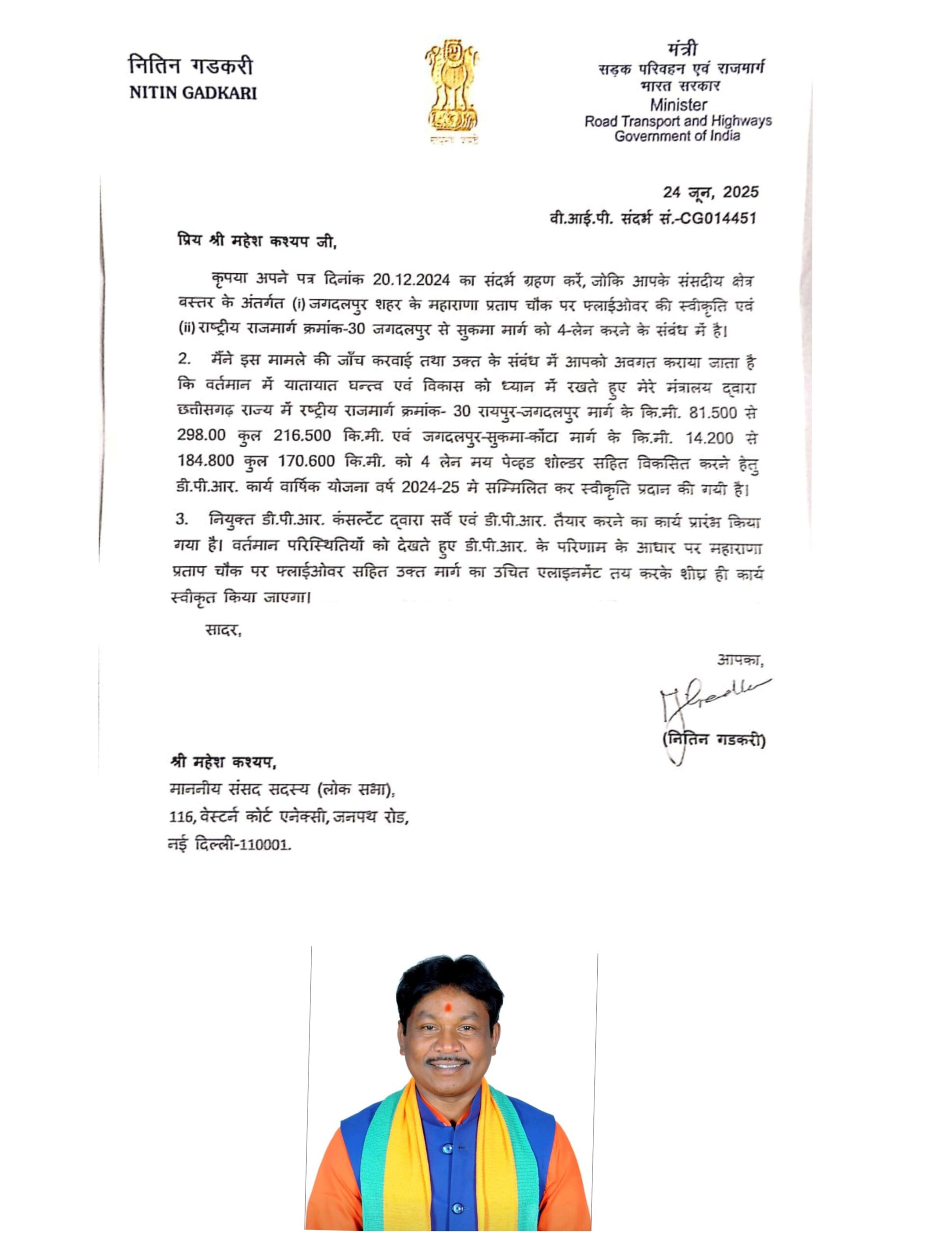 सांसद महेश कश्यप ने 20 दिसंबर 2024 को केंद्रीय मंत्री को पत्र भेजकर जगदलपुर की ट्रैफिक व्यवस्था और क्षेत्रीय विकास की आवश्यकता को रेखांकित करते हुए राष्ट्रीय राजमार्ग संख्या-30 के अंतर्गत जगदलपुर से सुकमा मार्ग को फोरलेन में परिवर्तित करने और महाराणा प्रताप चौक पर फ्लाईओवर निर्माण की मांग की थी। इसके जवाब में 24 जून 2025 को केंद्रीय मंत्री नितिन गडकरी ने पत्र भेजकर इन प्रस्तावों को वर्ष 2024-25 की वार्षिक योजना में डी.पी.आर. (डिटेल प्रोजेक्ट रिपोर्ट) निर्माण हेतु स्वीकृत करने की जानकारी दी।