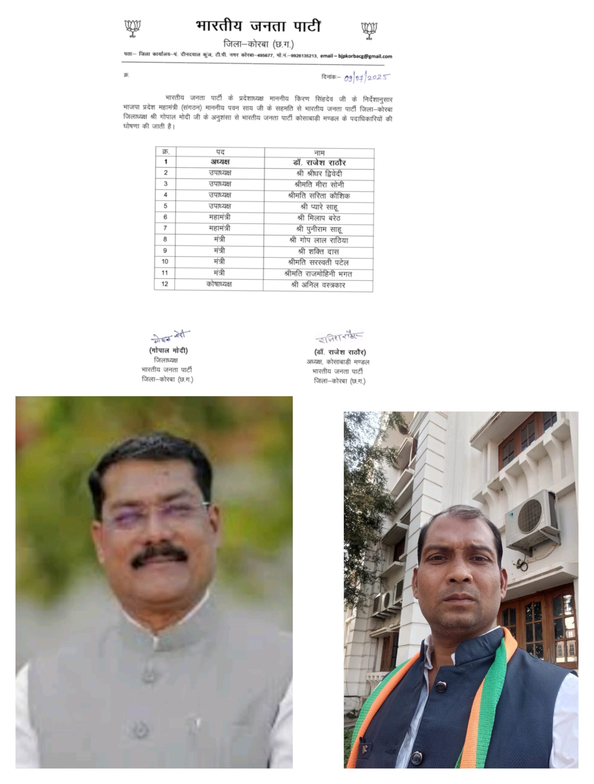 त्रिनेत्र टाइम्स कोरबा ****/ कोरबा। भारतीय जनता पार्टी जिला कोरबा के कोसाबाड़ी मंडल की नई कार्यकारिणी की घोषणा कर दी गई है। भाजपा प्रदेश अध्यक्ष किरण सिंहदेव के निर्देश एवं प्रदेश महामंत्री (संगठन) पवन साय की सहमति से भाजपा जिला अध्यक्ष श्री गोपाल मोदी ने कार्यकारिणी की सूची जारी की।