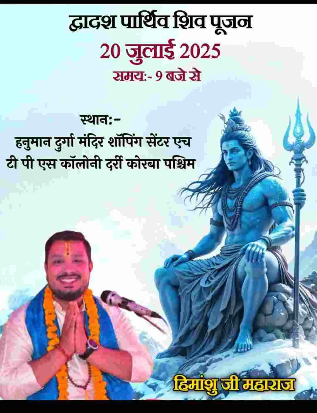 ┬арддреНрд░рд┐рдиреЗрддреНрд░ рдЯрд╛рдЗрдореНрд╕ рдХреЛрд░рдмрд╛ ****/┬а (рдХреЛрд░рдмрд╛) рд╢реНрд░рд╡рдг рдорд╛рд╕ рдХреА рдкреБрдгреНрдпрдзрд╛рд░рд╛ рдореЗрдВ рднрдХреНрддрд┐ рдХрд╛ рдорд╣рд╛рдкрд░реНрд╡ рдЖрдиреЗ рд╡рд╛рд▓рд╛ рд╣реИред рдПрдЪрдЯреАрдкреАрдПрд╕ рдХреЙрд▓реЛрдиреА, рджрд░реНрд░реА рдХреЛрд░рдмрд╛-рдкрд╢реНрдЪрд┐рдо рд╕реНрдерд┐рдд рд╢реНрд░реА рд╣рдиреБрдорд╛рди-рджреБрд░реНрдЧрд╛ рдордВрджрд┐рд░ рдкрд░рд┐рд╕рд░ рдореЗрдВ 20 рдЬреБрд▓рд╛рдИ рдХреЛ рджреНрд╡рд╛рджрд╢ рдкрд╛рд░реНрдерд┐рд╡ рд╢рд┐рд╡ рдкреВрдЬрди рдХрд╛ рдЖрдпреЛрдЬрди рдХрд┐рдпрд╛ рдЬрд╛ рд░рд╣рд╛ рд╣реИред рдпрд╣ рд╡рд┐рд╢реЗрд╖ рдЕрдиреБрд╖реНрдард╛рди рд╕реБрдмрд╣ 9:00 рдмрдЬреЗ рд╕реЗ рд╡рд┐рдзрд┐-рд╡рд┐рдзрд╛рдирдкреВрд░реНрд╡рдХ рдкреНрд░рд╛рд░рдВрдн рд╣реЛрдЧрд╛ред