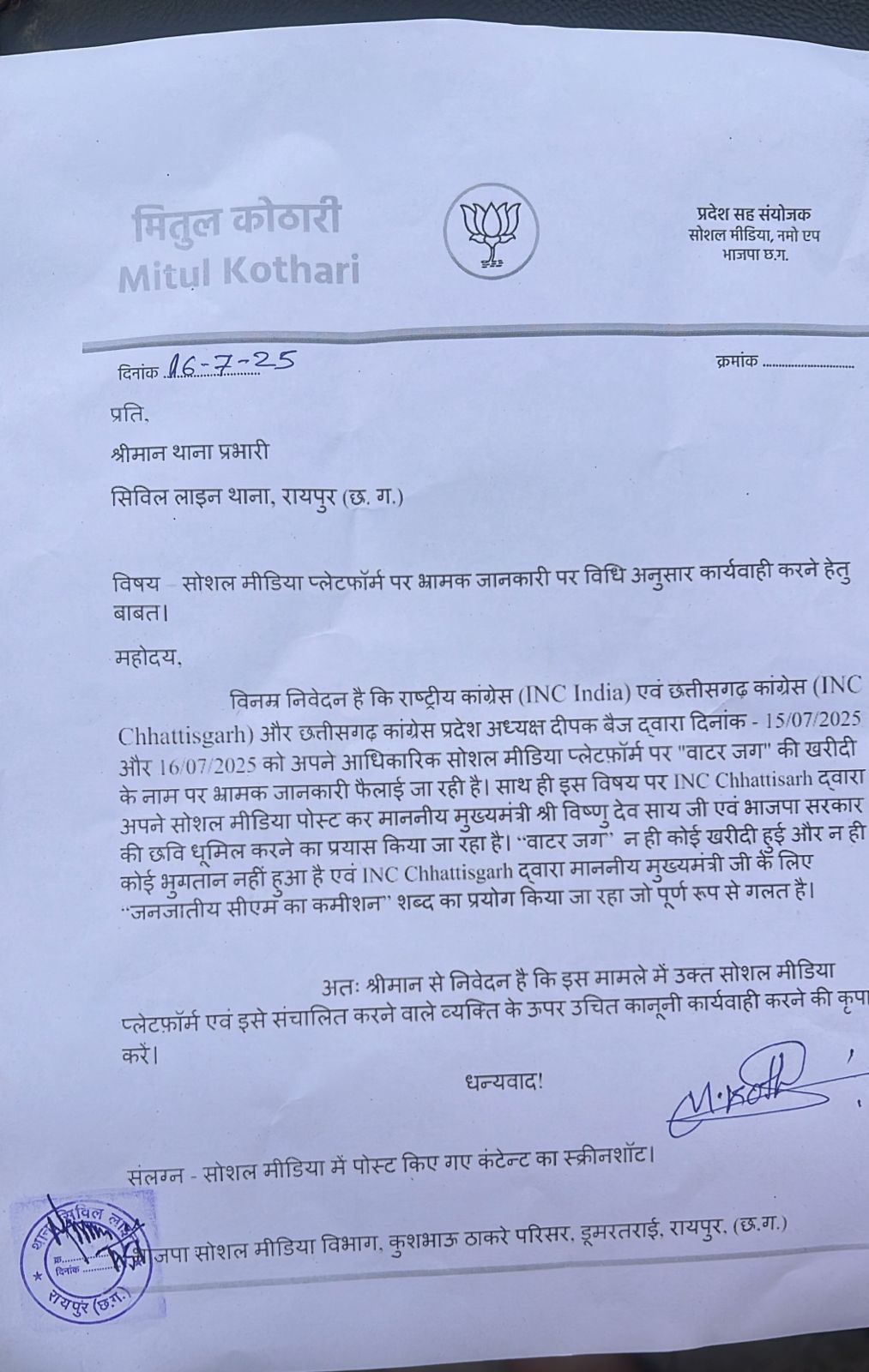 भाजपा सोशल मीडिया व नमो एप सेल के प्रदेश सह-संयोजक मितुल कोठारी ने बताया कि कांग्रेस द्वारा 15 और 16 जुलाई को अपने आधिकारिक सोशल मीडिया प्लेटफॉर्म पर मुख्यमंत्री विष्णुदेव साय और भाजपा सरकार की छवि धूमिल करने का प्रयास किया गया। उन्होंने कहा कि कांग्रेस ने “वाटर जग” की खरीदी को लेकर भ्रामक और झूठी जानकारी फैलाई, जबकि न तो ऐसी कोई खरीदी हुई है और न ही कोई भुगतान किया गया।