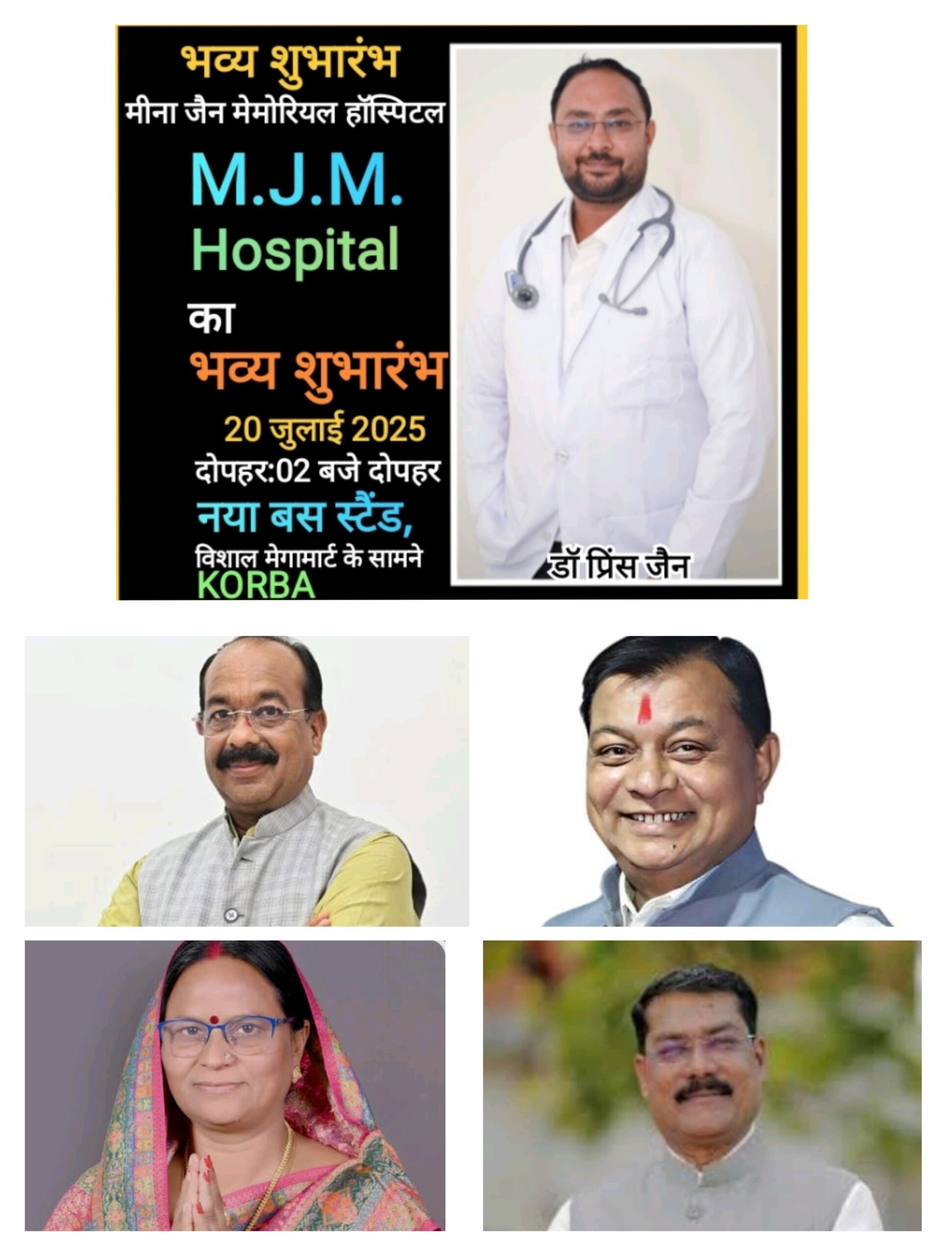 त्रिनेत्र टाइम्स कोरबा *****/ कोरबा शहर में स्वास्थ्य सेवाओं के क्षेत्र में एक नया अध्याय जुड़ने जा रहा है। नया बस स्टैंड, विशाल मेगामार्ट के सामने स्थित मीना जैन मेमोरियल (MJM) हॉस्पिटल का भव्य शुभारंभ इस रविवार दोपहर 2 बजे होगा। यह ऐतिहासिक अवसर पूज्य गुरुमाता 105 आर्यिका श्री अखंडमती माताजी एवं अभेदमती माताजी के पावन सान्निध्य में संपन्न होगा।