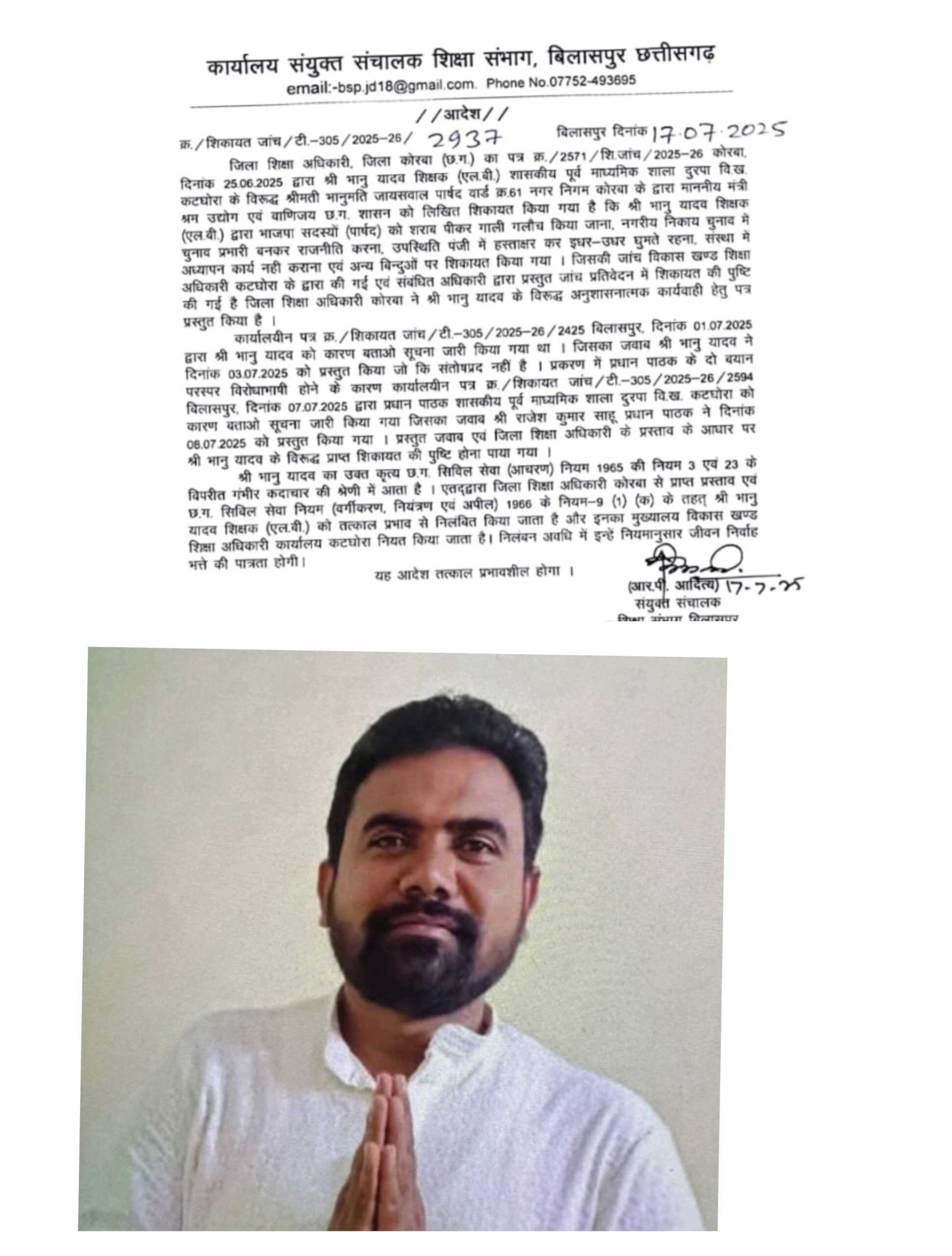 त्रिनेत्र टाइम्स कोरबा ****/ कोरबा/बिलासपुर। शासकीय पूर्व माध्यमिक शाला दुरपा, विकासखंड कटघोरा में पदस्थ शिक्षक भानु यादव पर गाज गिर गई है। भाजपा पार्षदों से अभद्रता, चुनावी राजनीति में खुला दखल और शैक्षणिक जिम्मेदारियों में भारी लापरवाही के आरोपों के चलते उन्हें तत्काल प्रभाव से निलंबित कर दिया गया। यह कार्रवाई संयुक्त संचालक शिक्षा, बिलासपुर संभाग आर.पी. आदित्य द्वारा की गई है।