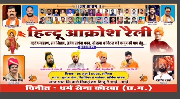 त्रिनेत्र टाइम्स कोरबा ****/ धर्मांतरण, लव जिहाद, अवैध प्रार्थना भवन और गौहत्या जैसी गंभीर सामाजिक बुराइयों के खिलाफ जनजागरण और कड़े कानून की मांग को लेकर धर्म सेना कोरबा द्वारा आगामी शनिवार 26 जुलाई 2025 को दोपहर 12 बजे सुभाष चौक से “हिन्दू आक्रोश रैली” का आयोजन किया जा रहा है।