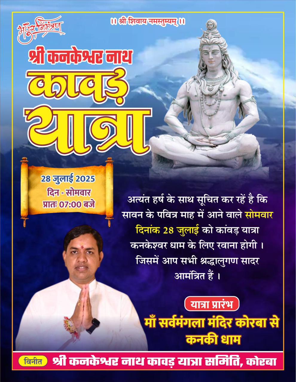28 जुलाई को कांवड़ यात्रा : मां सर्वमंगला मंदिर कोरबा से कंनकी धाम तक शोभायात्रा, पार्षद नरेंद्र देवांगन रहेंगे शामिल