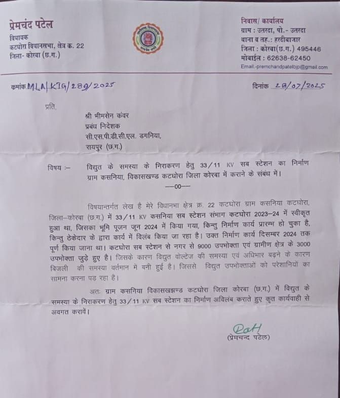 कटघोरा शहर की बिजली व्यवस्था सुधारने विधायक प्रेमचंद पटेल की सख्ती – कसनिया सब स्टेशन का निर्माण सितंबर तक पूर्ण करने के निर्देश, लापरवाही पर होगी कार्रवाई