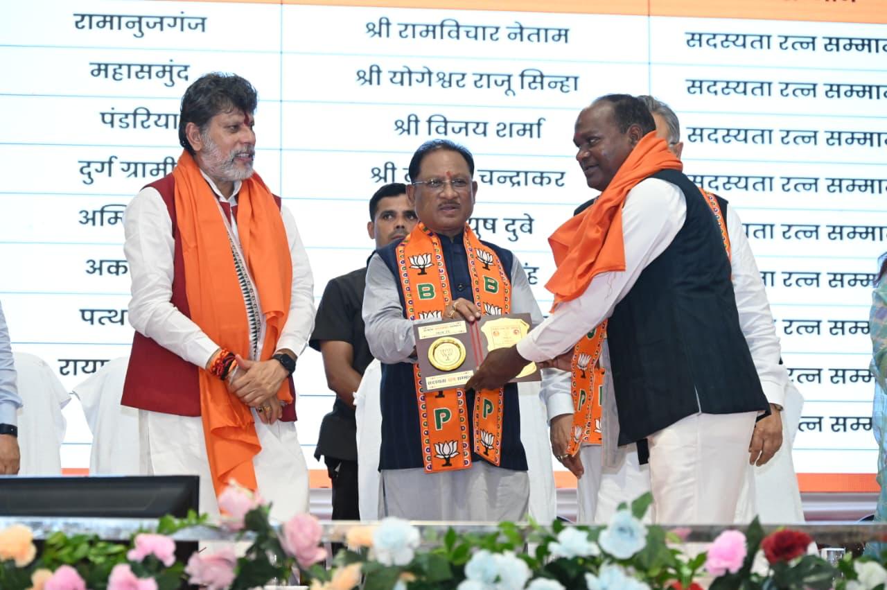 त्रिनेत्र टाइम्स कोरबा ****/ नवा रायपुर। मुख्यमंत्री निवास, अटल नगर नया रायपुर में भारतीय जनता पार्टी द्वारा उत्कृष्ट सदस्यता सम्मान समारोह 2024-25 का भव्य आयोजन किया गया। इस अवसर पर सदस्यता अभियान में उत्कृष्ट प्रदर्शन करने वाले विधायकों, सांसदों, जिला पदाधिकारियों एवं कार्यकर्ताओं को उत्कृष्ट सदस्यता सम्मान, सदस्यता भूषण सम्मान और सदस्यता रत्न सम्मान से सम्मानित किया गया।