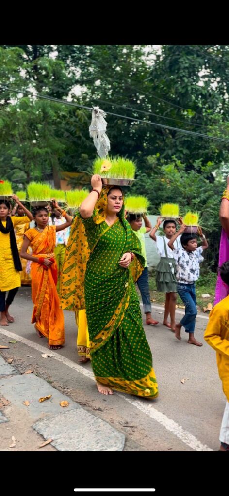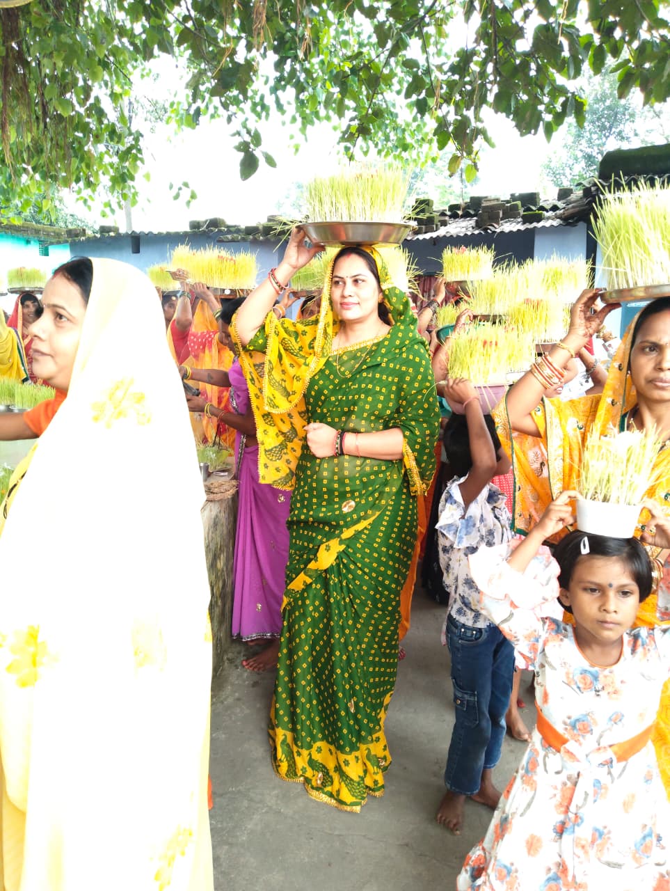 शोभायात्रा में महिलाएं पारंपरिक परिधानों में सजी-धजी, सिर पर भोजली की टोकरी लिए हुए चल रही थीं, जबकि पुरुष बाजे-गाजे, ढोल-ढमाकों और भजन-कीर्तन की धुन पर नाचते-गाते आगे बढ़ रहे थे। पूरे मार्ग में ‘जय भोजली माता’ और भक्ति गीतों की गूंज ने वातावरण को भक्तिमय बना दिया।