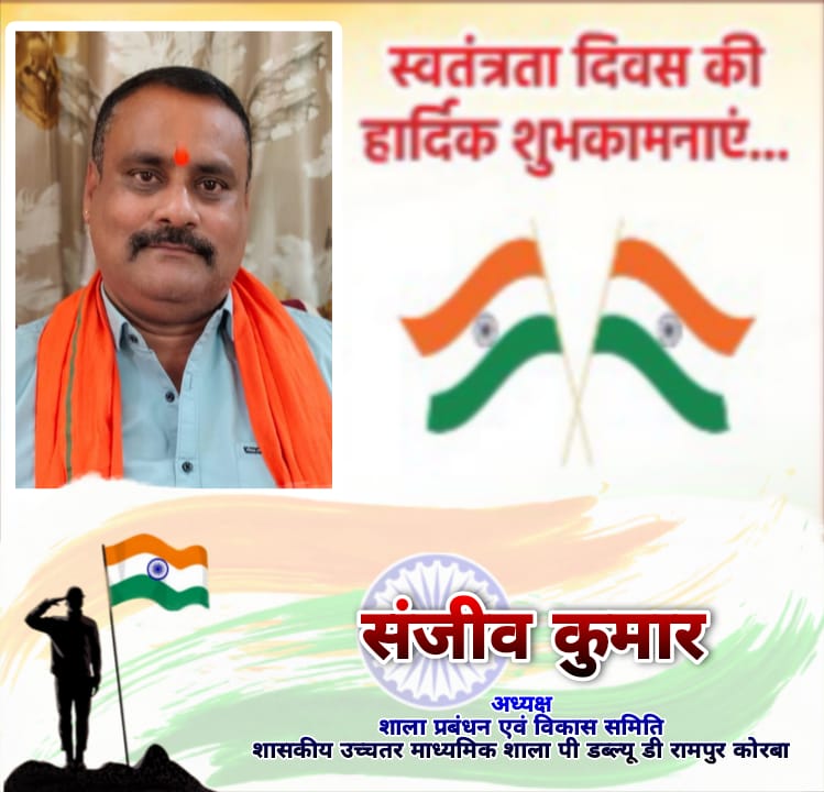 त्रिनेत्र टाइम्स कोरबा ****/ कोरबा। शाला प्रबंधन एवं विकास समिति, शासकीय उच्चतर माध्यमिक शाला पी. डब्ल्यू. डी. रामपुर, कोरबा के अध्यक्ष श्री संजीव कुमार ने स्वतंत्रता दिवस की 79वीं वर्षगांठ पर जिले के समस्त नागरिकों को हार्दिक शुभकामनाएं और बधाई दी हैं। उन्होंने कहा कि 15 अगस्त का दिन हमारे देश के गौरव, त्याग और बलिदान का प्रतीक है, जो हमें स्वतंत्रता सेनानियों के अदम्य साहस और संघर्ष की याद दिलाता है।