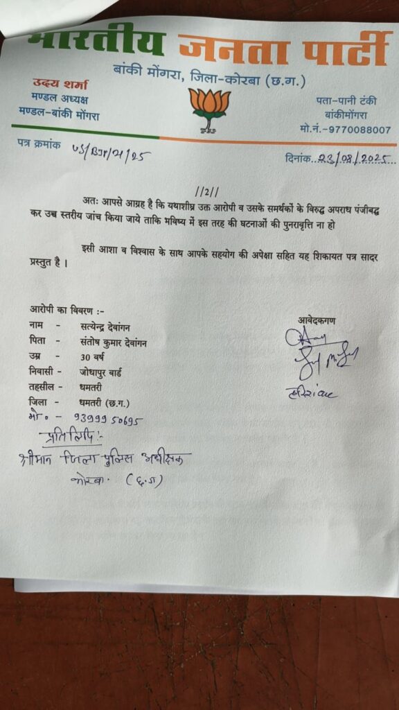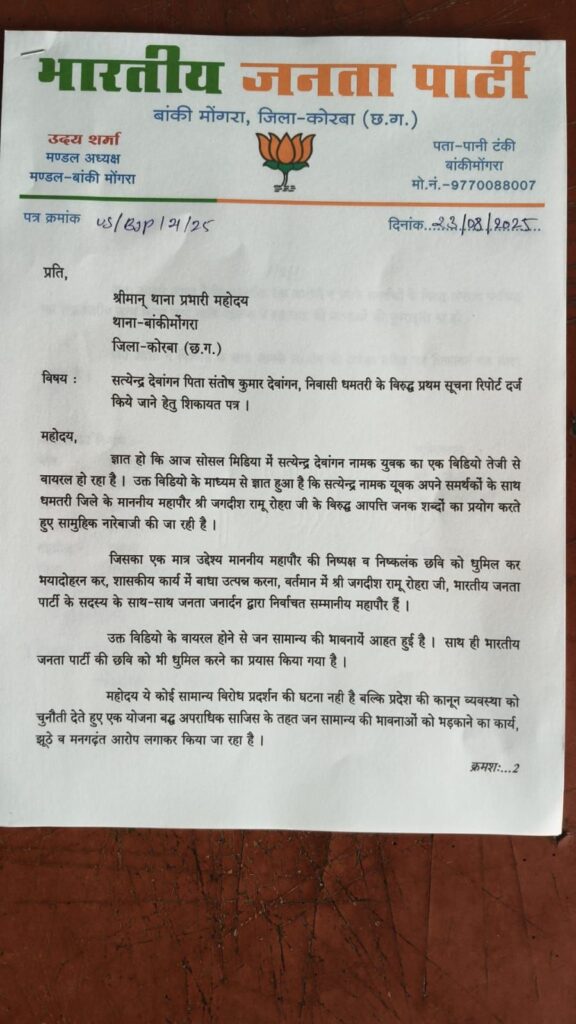 कोरबा/बांकीमोंगरा। सोशल मीडिया पर तेजी से वायरल हो रहे एक वीडियो को लेकर भाजपा कार्यकर्ताओं ने विरोध दर्ज कराया है। मामला बांकीमोंगरा मंडल भाजपा अध्यक्ष उदय शर्मा के नेतृत्व में थाना बांकीमोंगरा पहुंचकर थाना प्रभारी को लिखित शिकायत सौंपने का है।