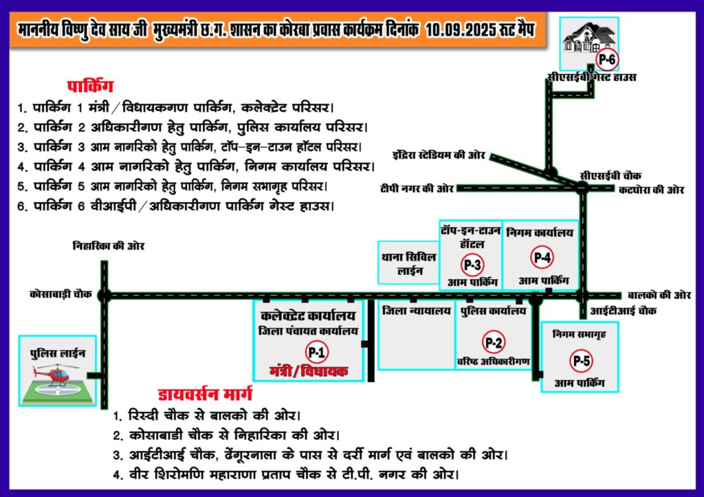 त्रिनेत्र टाइम्स कोरबा ****/ छत्तीसगढ़ प्रदेश के माननीय मुख्यमंत्री श्री विष्णुदेव साय का दिनांक 10 सितंबर 2025 को कोरबा में एक दिवसीय दौरा है। मुख्यमंत्री के जिले में आगमन एवं विभिन्न कार्यक्रमों में भागीदारी के मद्देनजर यातायात पुलिस ने विशेष सुरक्षा उपाय अपनाते हुए रोड डायवर्सन प्लान जारी किया है।