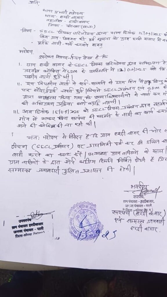 गुस्साए ग्रामीणों ने थाना प्रभारी को एक कड़ा विरोध पत्र सौंपा। पत्र में उन्होंने लिखा कि 15 सितंबर को एसईसीएल दीपका परियोजना ने बिना ग्राम पंचायत की अनुमति व सहमति के बलपूर्वक सर्वे कार्य कराने का प्रयास किया, जबकि 12 सितंबर को एसडीएम की मौजूदगी में त्रिपक्षीय वार्ता में 7 बिंदुओं पर सहमति बनी थी। बावजूद इसके प्रबंधन ने अनुशासन की धज्जियां उड़ाते हुए बिना सरपंच की सहमति सर्वे कराने की ठान ली।