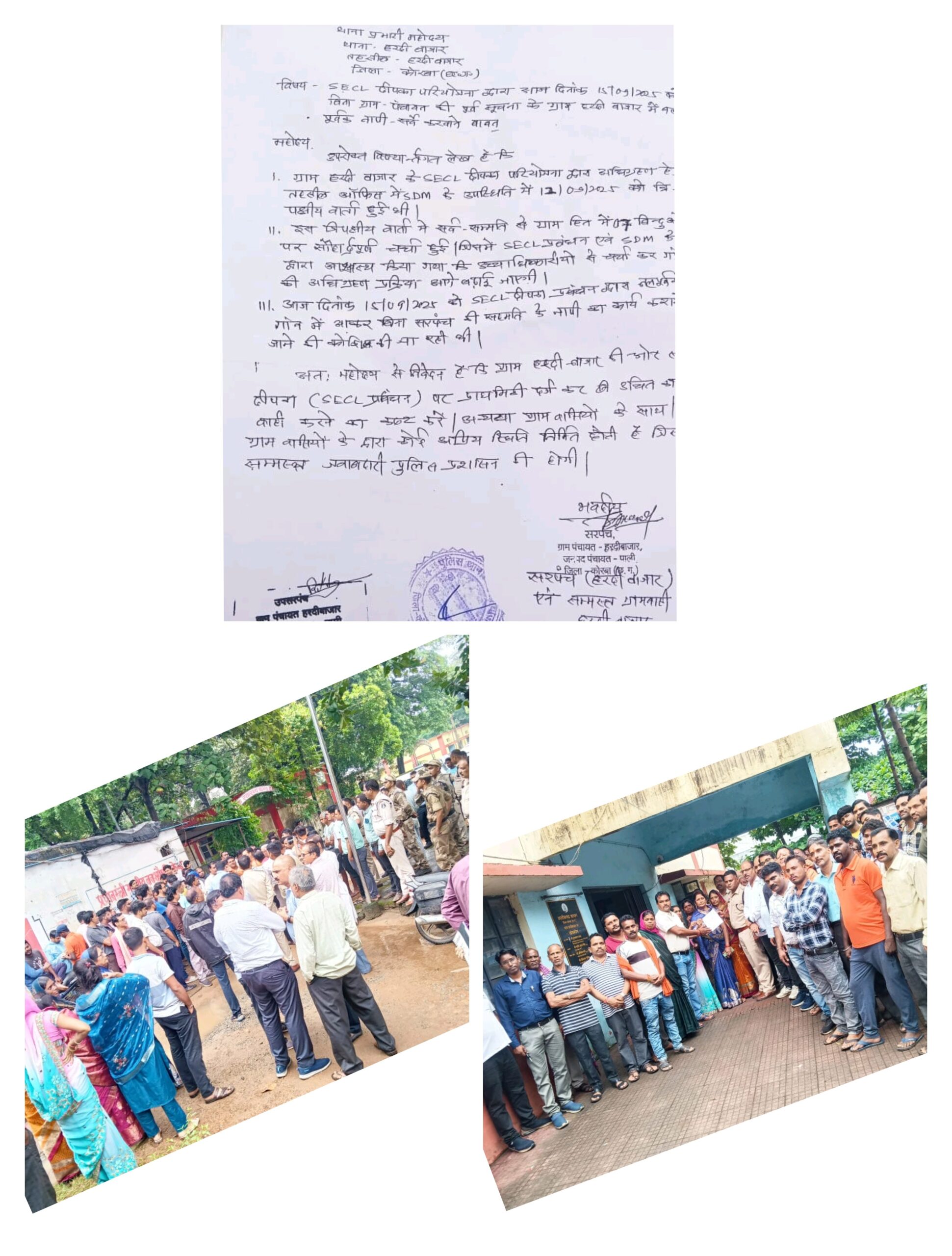 इसके पश्चात ग्रामीणों ने थाना प्रभारी को एक ज्ञापन सौंपा, जिसमें उन्होंने बताया कि एसईसीएल दीपका परियोजना की टीम ने बिना ग्राम पंचायत की पूर्व अनुमति के बलपूर्वक सर्वे कराने का प्रयास किया। ज्ञापन में यह भी उल्लेख किया गया कि 12 सितंबर को एसडीएम की उपस्थिति में त्रिपक्षीय वार्ता संपन्न हुई थी, जिसमें ग्राम हित में 7 बिंदुओं पर सहमति बनी थी। साथ ही प्रबंधन ने उच्च अधिकारियों से चर्चा कर आगे बढ़ने का आश्वासन भी दिया था।