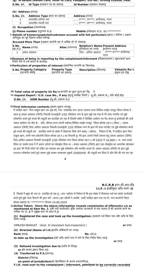 त्रिनेत्र टाइम्स कोरबा****/कोरबा, 17 सितंबर 2025 – शहर में एक चौंकाने वाला मामला प्रकाश में आया है, जहां अवैध शराब विक्रेता अंचल अग्रवाल उर्फ जिनी अग्रवाल पर गंभीर आरोप लगे हैं। साहिल खान (28 वर्ष), निवासी एमपी नगर अटल आवास थाना सिविल लाइन रामपुर की शिकायत पर जिनी अग्रवाल के विरुद्ध FIR दर्ज की गई है। आरोप है कि जिनी अग्रवाल ने साहिल खान का गिरवी रखा मोबाइल अनलॉक कर उसके निजी फोटो को एआई तकनीक की मदद से एडिट करके ब्लैकमेल करना शुरू कर दिया।