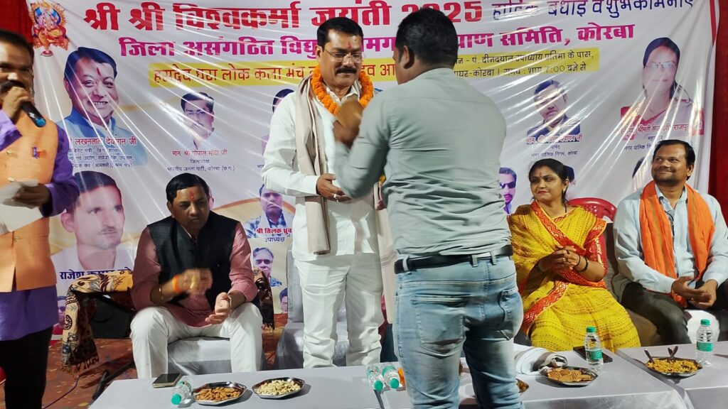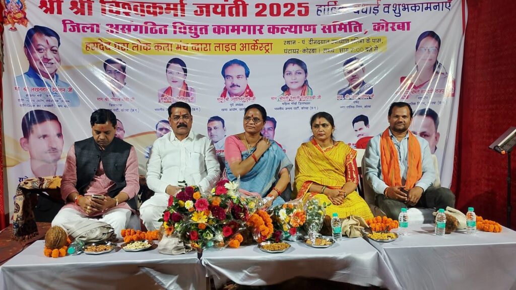 कोरबा, 18 सितंबर 2025। देवशिल्पी भगवान विश्वकर्मा की जयंती के अवसर पर जिला असंगठित विद्युत कामगार कल्याण समिति कोरबा द्वारा घंटाघर के पास भगवान विश्वकर्मा जी की प्रतिमा स्थापित कर भव्य आयोजन किया गया। इस अवसर पर पूरे विधिविधान के साथ पूजा-अर्चना की गई और शाम को आकर्षक भजन संध्या का आयोजन किया गया।