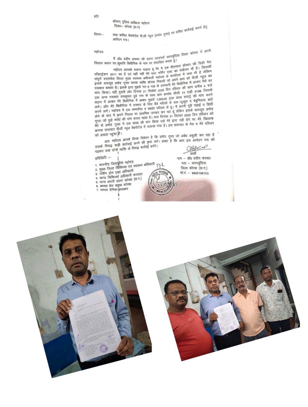 त्रिनेत्र टाइम्स कोरबा ****/ कोरबा। जिले के सरगुंडिया क्षेत्र के निवासी और वरिष्ठ डॉक्टर डॉ. प्रदीप कश्यप ने पुलिस अधीक्षक को लिखित शिकायत पत्र देकर स्थानीय पत्रकार प्रमोद गुप्ता पर गंभीर आरोप लगाए हैं। डॉ. कश्यप का कहना है कि प्रमोद गुप्ता पी.जी. न्यूज नामक वेबसाइट के माध्यम से उनसे अवैध वसूली कर रहा है और यह मामला उनके परिवार और क्लिनिक दोनों के लिए चिंता का विषय बन गया है।